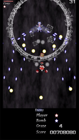 2、【四阶难度渐进挑战】 弹幕难度分为四个递进等级:简单、普通、困难、疯狂。即便是入门难度也充满挑战,满屏飞舞的弹幕构成了眼花缭乱的图案,正是这种难度设计让玩家不断挑战自我。