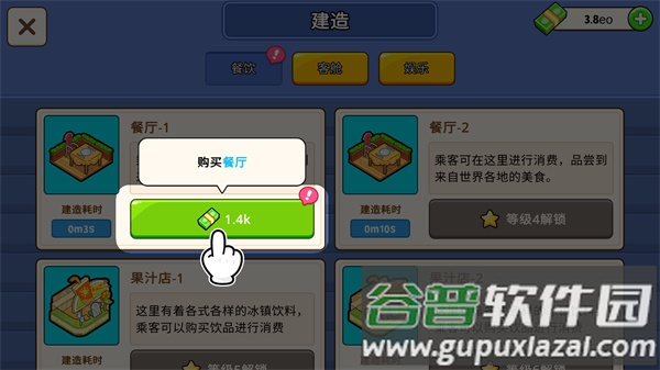 2、积累足够资金后,可逐步建造餐饮区、客舱与娱乐设施,部分建筑需达到指定等级才能解锁。