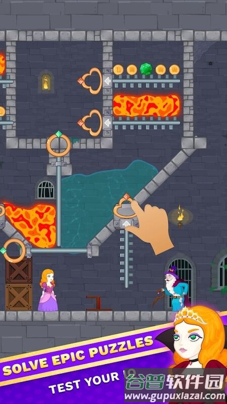 2.包含多种互动元素:将水倒入熔岩中和危险,解除陷阱束缚,拉动或推回别针,寻找隐藏宝藏,拯救公主等丰富机制;