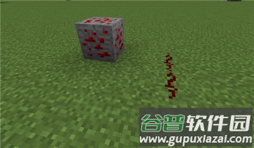图中左侧为红石矿石,开采后可获得红石粉,放置于地面即形成红石线路。开采时矿石会自然发光,属于正常现象,建议使用铁镐或更高级工具采集。