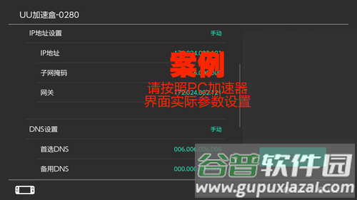 4、将IP地址、子网掩码、网关和DNS修改为手机加速器提供的参数,若数字不足三位需在前补零;