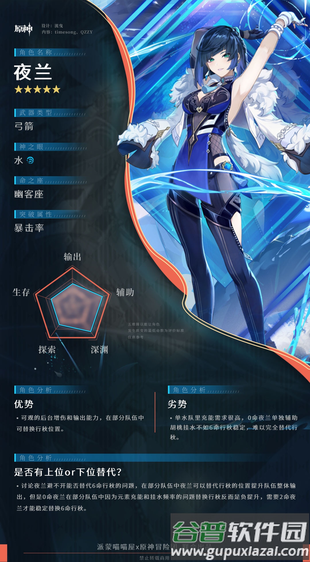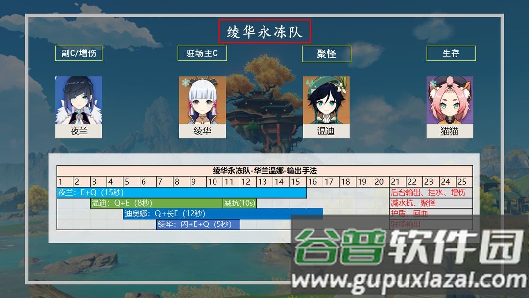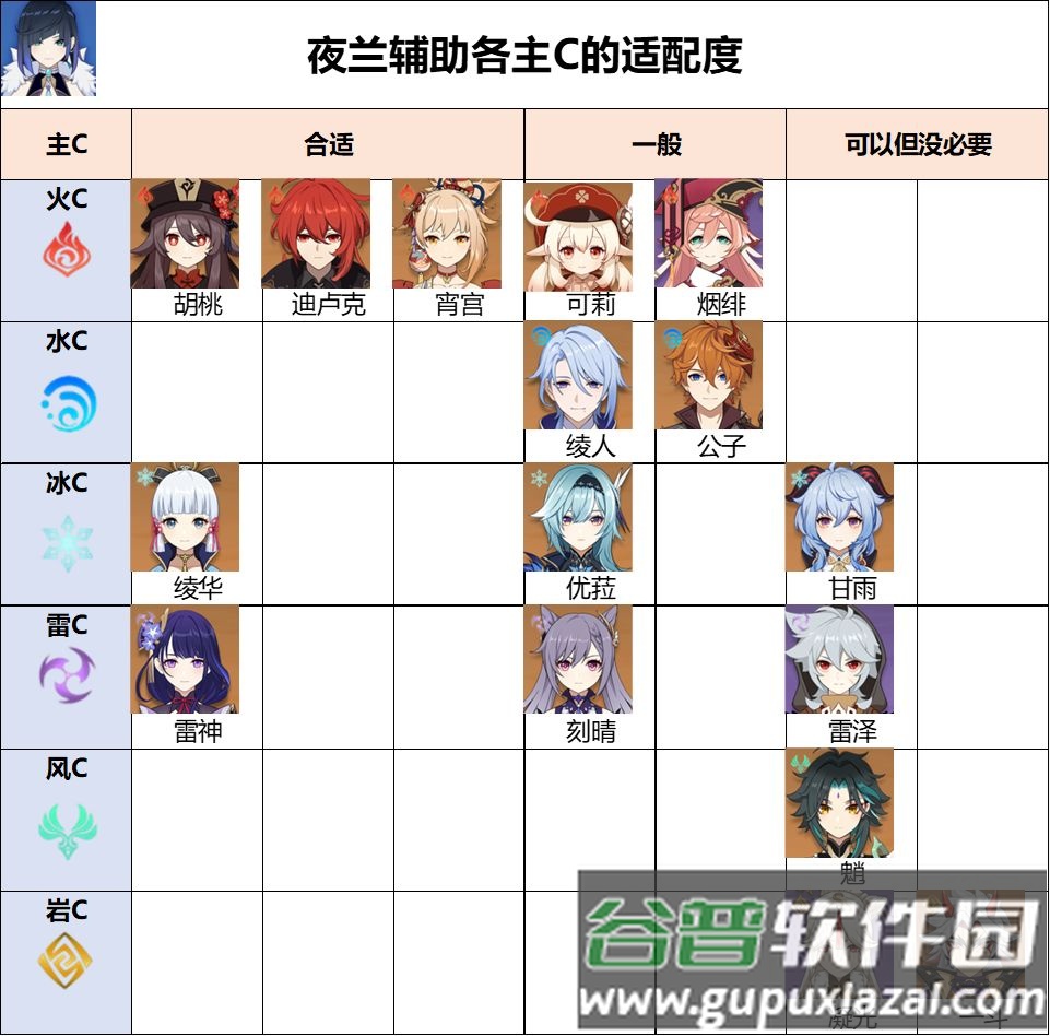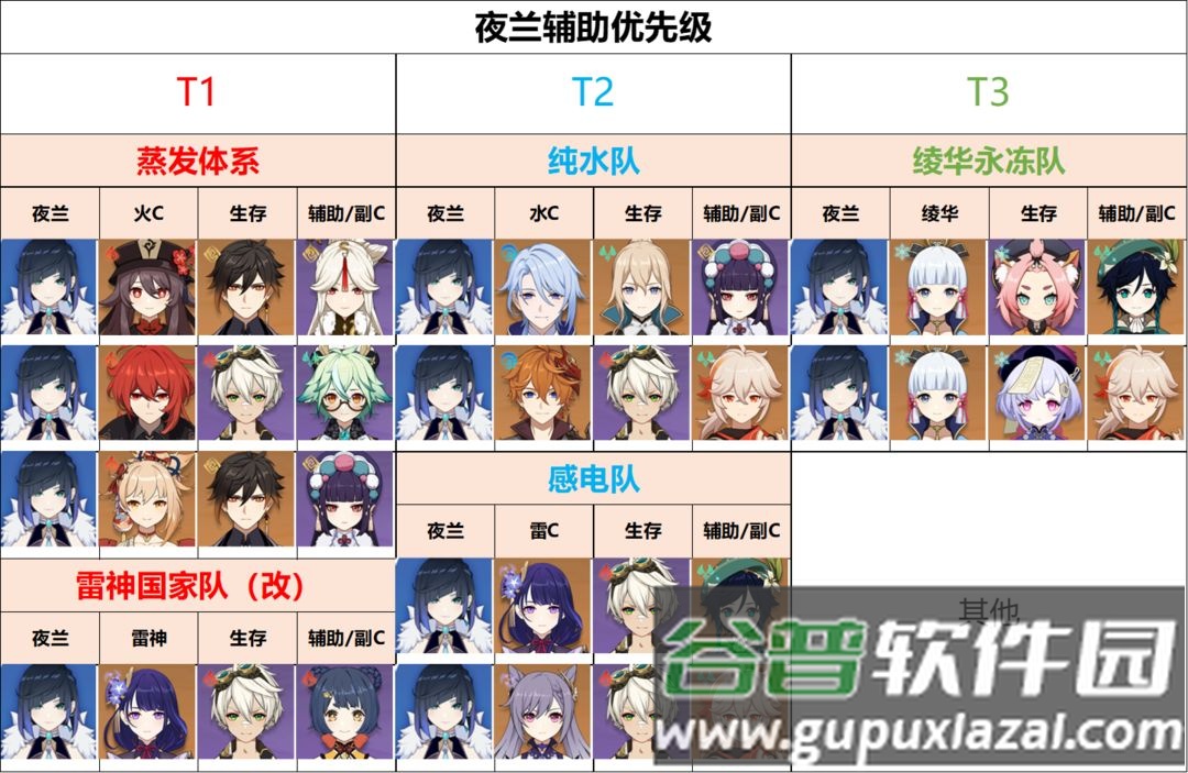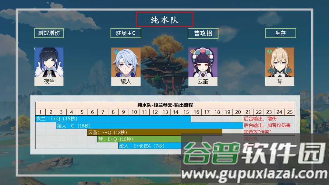纯水队:夜兰可先手挂水,配合风系角色减水抗,双水组合还能互相充能;她的增伤效果对水属性主C也有明显提升。
