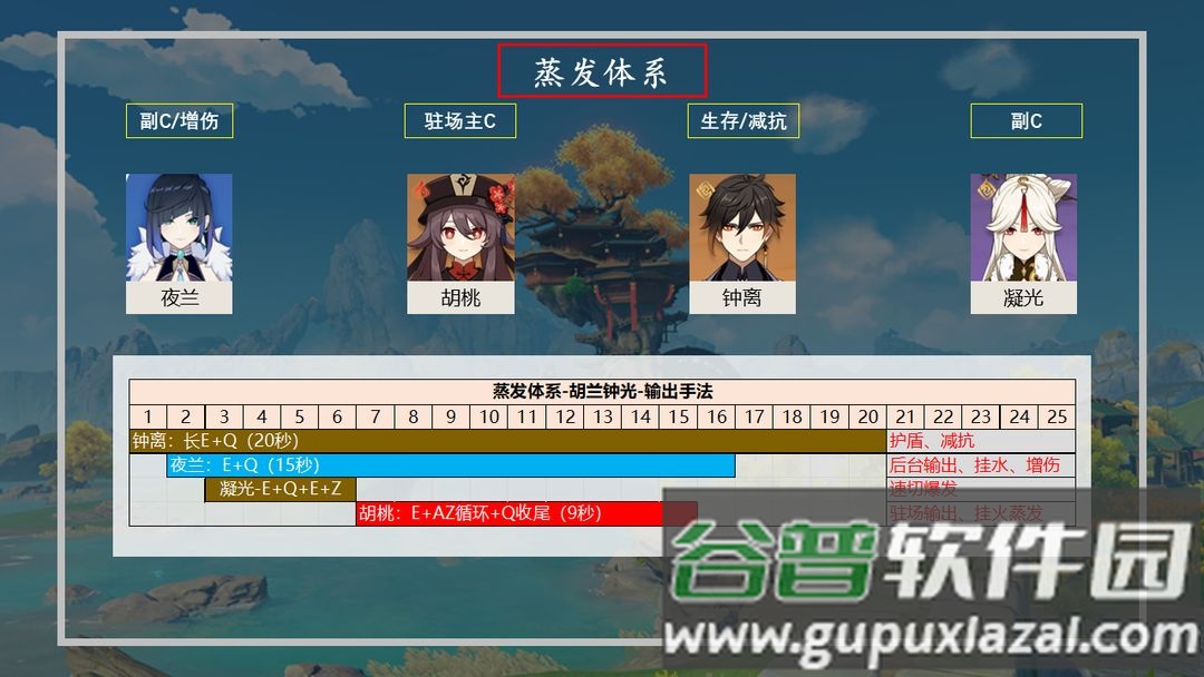 蒸发队:夜兰与行秋功能近似,负责后台挂水协助火系主C触发蒸发反应,区别在于夜兰还能提供增伤效果,提升队伍整体输出上限。