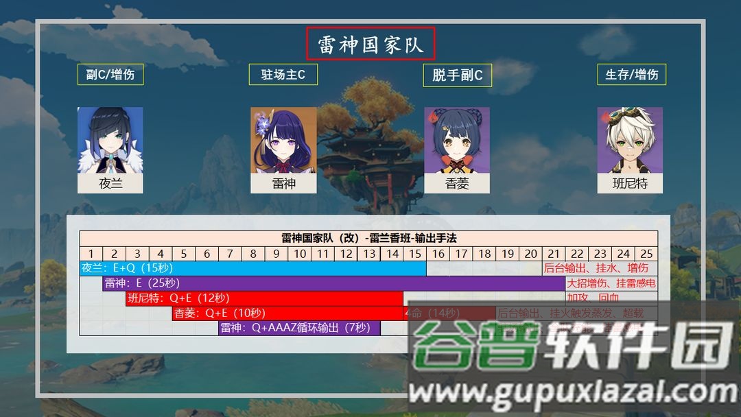 雷国变阵:用夜兰替换行秋,在后台同时与雷神触发感电、与香菱触发蒸发,其增伤天赋也能进一步提升雷神的爆发伤害。