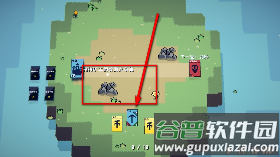 3、拖动矿工挖出的金币购买城堡防守角色;