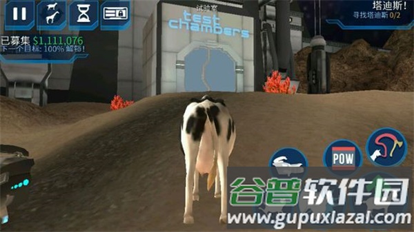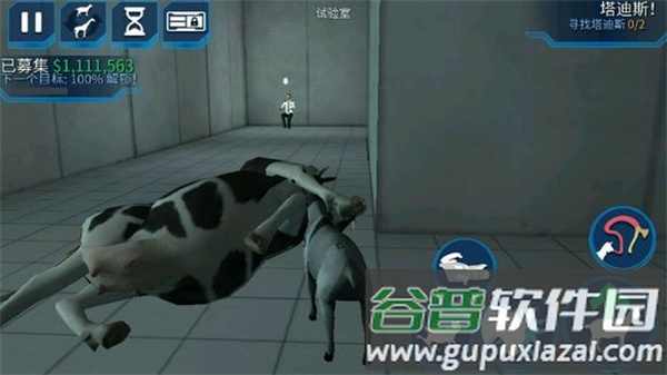 解锁实验室地图,完成四项实验,踩下蓝色按钮会掉落一头奶牛;将牛放置在指定平台;进入后先前往左侧角落;待玻璃开启后,绕着牛转圈即可触发。