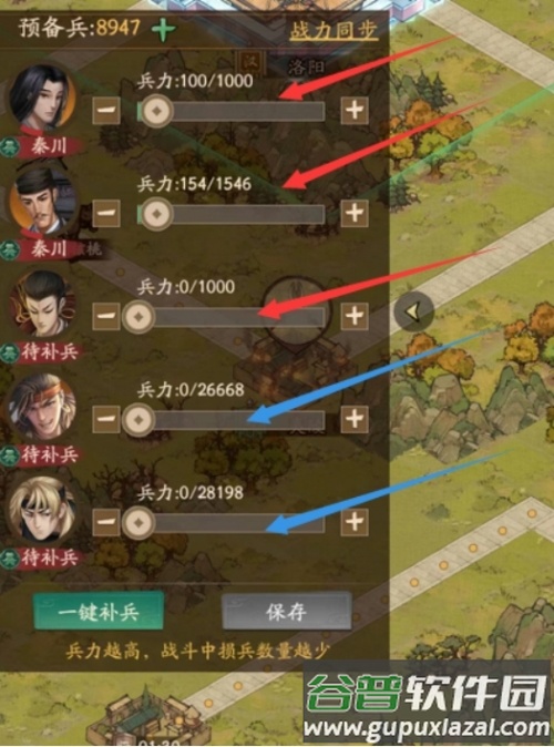 红色箭头加兵十分之一用于堵路;蓝色箭头主力队满兵抢占城池。