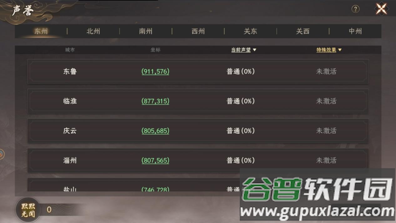 世界分为东州、北州、南州、西州、关东、关西、中州七大领地,每块领地包含数十座城市。打开【声誉系统】,可查看各城市具体坐标,为日后征战提供方位指引;也能直接了解玩家在各城的声望等级及已激活的特殊效果。