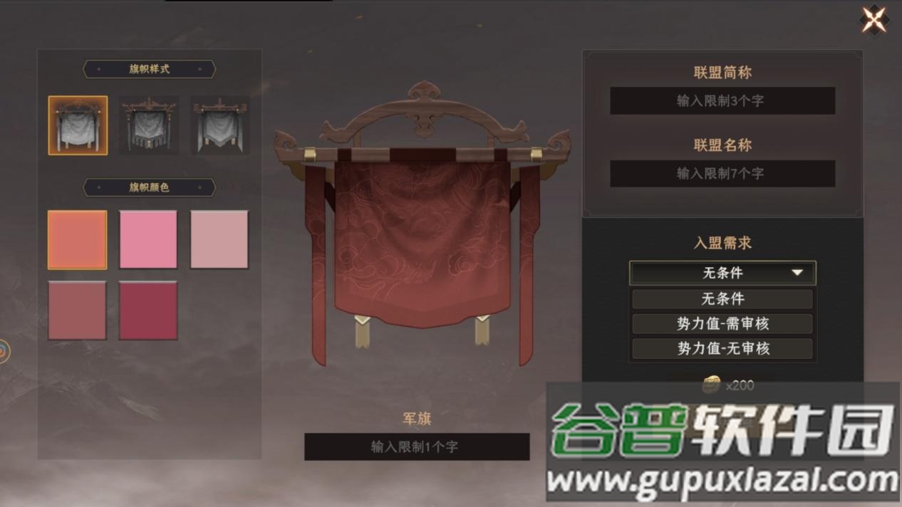 进入联盟创建界面,依次选择气质样式、颜色,为联盟命名并设置入盟条件,即可消耗200金贝完成创建。