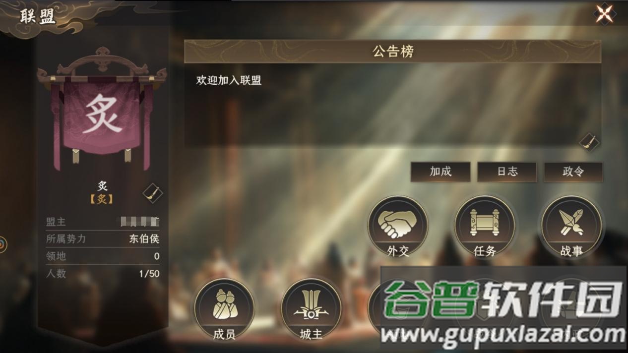 新建联盟最多容纳50人。成员页面可查看所有成员的官职、战功、贡献、势力、位置等信息。盟主可在此任命官职:除盟主外,设太师(1名)、将军(2名)、先锋(4名),其余为普通成员。盟主拥有全部权限;太师仅不能任免官员、指挥作战或取消内政研究,其他权限与盟主一致;官职越低,权限越少。