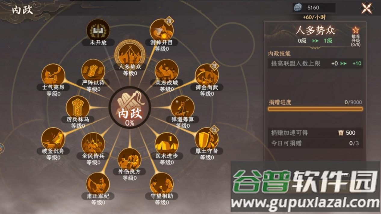 内政系统提供多项隐藏增益,如士气高昂、外伤良方、全民皆兵、破釜沉舟等,可提升士气、加速伤兵恢复、加快征兵速度。相比未加入联盟的玩家,联盟成员已占据先机。但需注意:每个内政技能均需成员共同捐赠至9000进度方可解锁,这对盟主的号召力是一大考验。