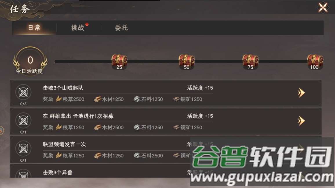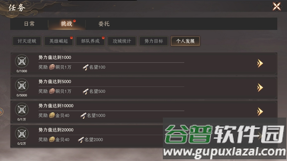 挑战模块提供的铜贝数量最多,但要求也更高。基础任务“讨灭逆贼”击败10个任意等级山贼部队可得1000铜贝,即便使用初始武将也能轻松完成;击败数达到100时,可解锁一万铜贝奖励。这类近乎挂机的战斗奖励不容错过。其他挑战任务如英雄崛起、部队养成、攻城统计、个人发展等,需要玩家进一步成长,例如升级武将、参与城战、攻占城市、提升势力。零氪玩家前期的铜贝主要来源于此。