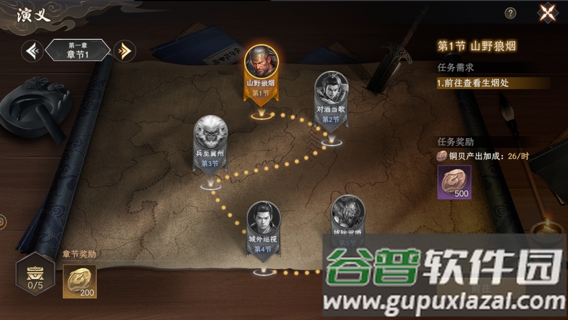 历练包含演义、周游和法阵三部分。演义模块需派遣部队至指定地点执行任务,完成章节内全部任务可领取章节奖励;通关所有章节后还能获得额外奖励。完成演义任务还能提高铸币所的铜贝基础产出。