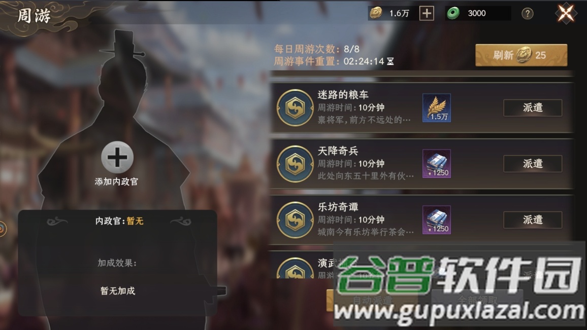 周游可自动派遣队伍,奖励种类多样,涵盖兵书、木材、石料、铜贝等。每日可免费刷新一次任务,奖励随之变更。