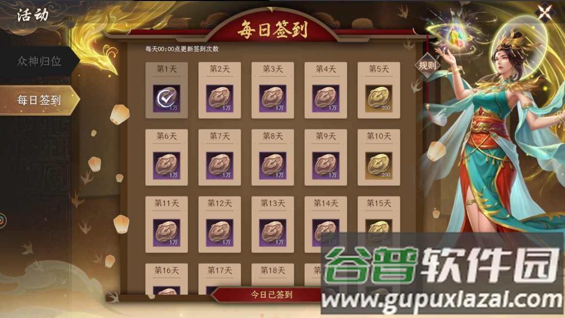 每日签到可获得1万铜贝,签到次数于每天00:00更新。进入社区,参与不定期更新的互动环节也有铜贝奖励。