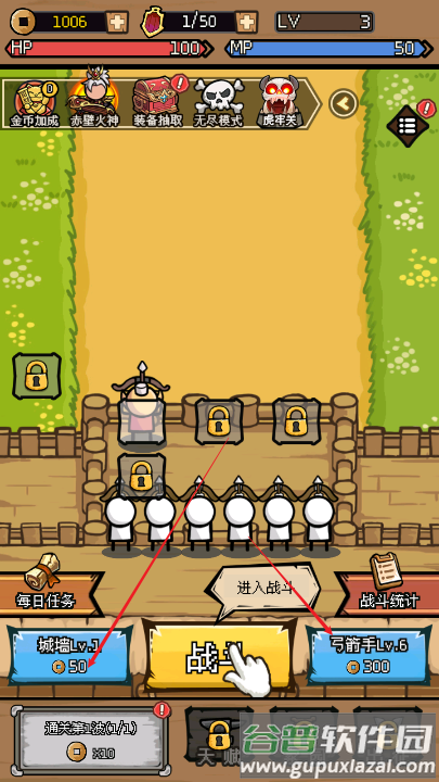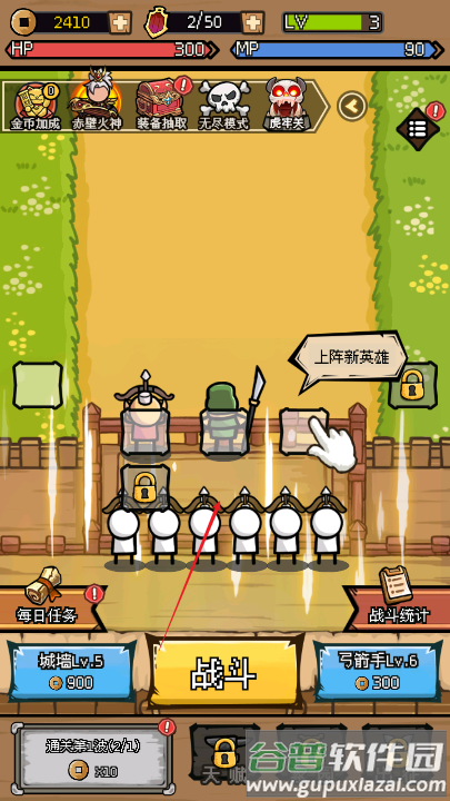 塔防战斗玩法:核心玩法围绕塔防展开,再现三国战场氛围。玩家需在路径上建造各类防御塔,如远程箭塔、范围投石塔、持续灼烧的火焰塔等,以阻挡敌人进攻。需结合地形与敌军路线进行布局:狭窄路口密集设置箭塔,开阔区域部署投石塔最大化杀伤。战斗中还可手动释放武将技能协同防御,例如关羽的青龙偃月斩能对前方造成重创。
