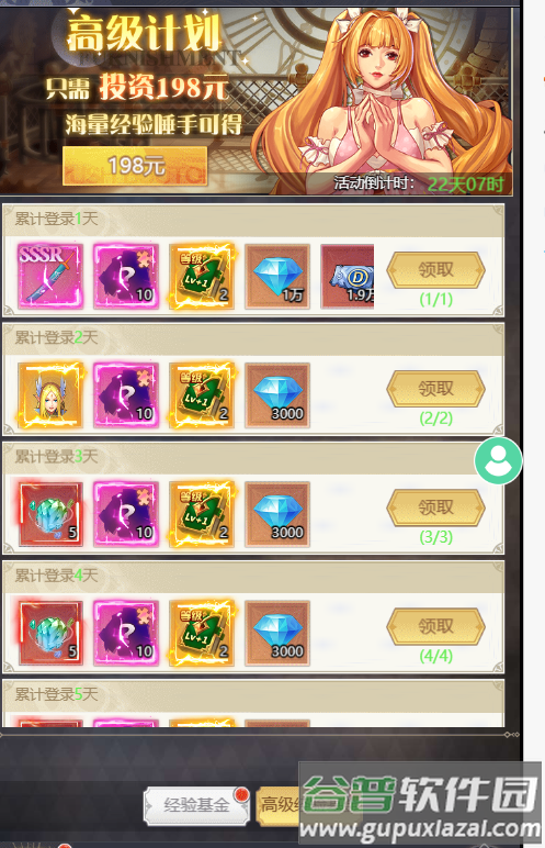 5. 购买经验基金(分别有经验基金和高级经验基金,经验基金需要98元,高级经验基金需要198元,需等到第二天才会出现)