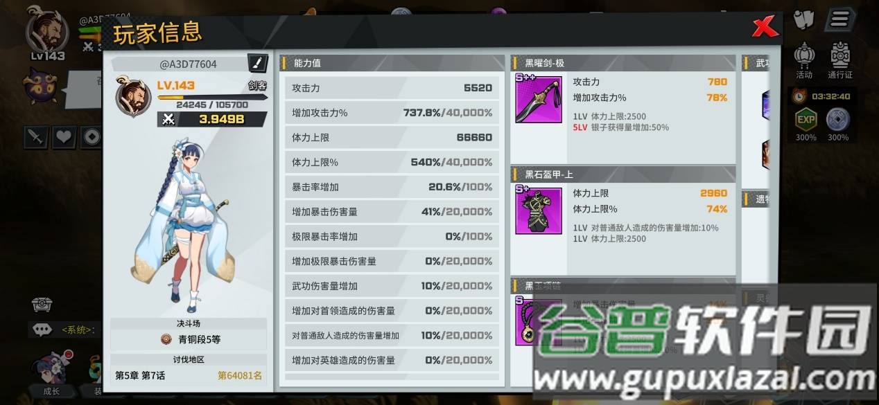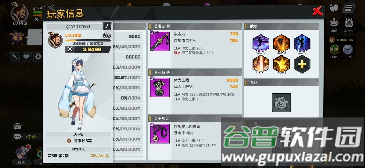 此类游戏的核心在于角色养成。角色信息界面展示了丰富的数值维度,主要养成点包括装备、武功、遗物和灵兽。