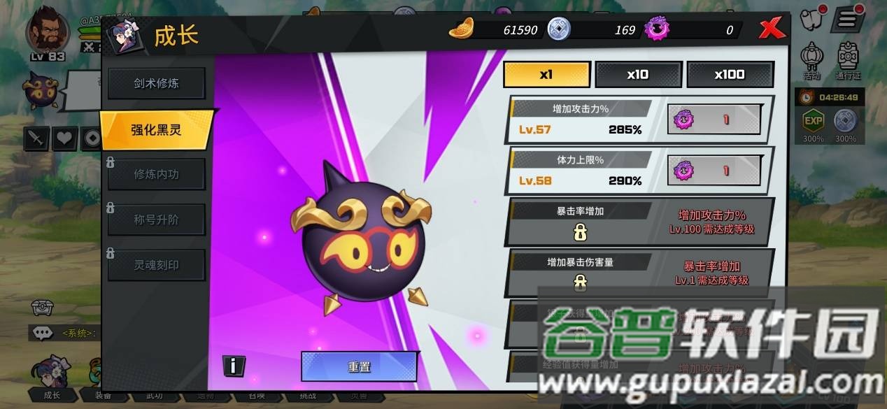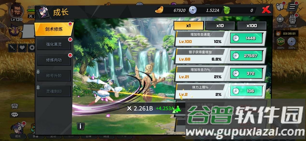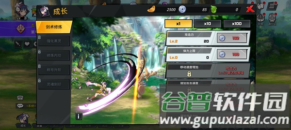 角色养成途径多样,包括剑术修炼、强化黑灵、修炼内功、称号升阶与灵魂刻印。除了常规的逐次提升,游戏还提供了便捷的十倍与百倍升级选项。