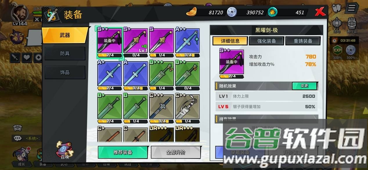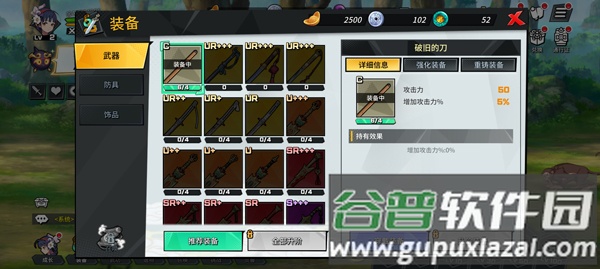 5、点击左下方装备图标,可更换或升级武器、防具、饰品等;