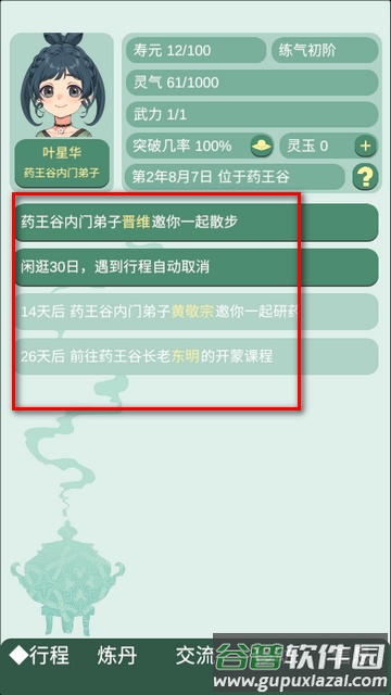 4、设定完成后,即可正式开启修炼旅程,依据行程安排进行各项操作。