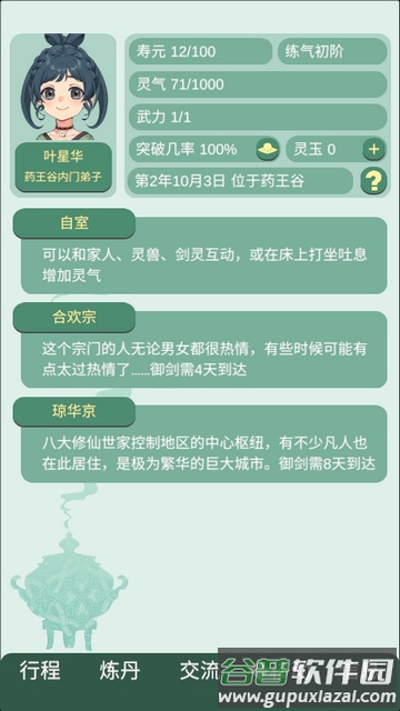 药王谷女修修炼手札是一款以文字模拟为主的修仙游戏,玩家将扮演一名女性修士,从幼年开始踏上修炼之路。游戏内可与师兄弟、师伯及师尊等多种角色互动,支持登门拜访、结交好友和赠送礼物等丰富操作,玩法简单易上手,欢迎免费下载体验。