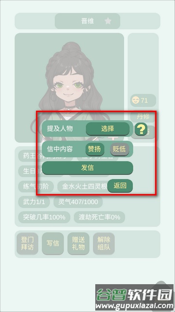 5、点击其他角色姓名可进入交互页面,进行写信、拜访、赠送礼物或邀请组队等操作。