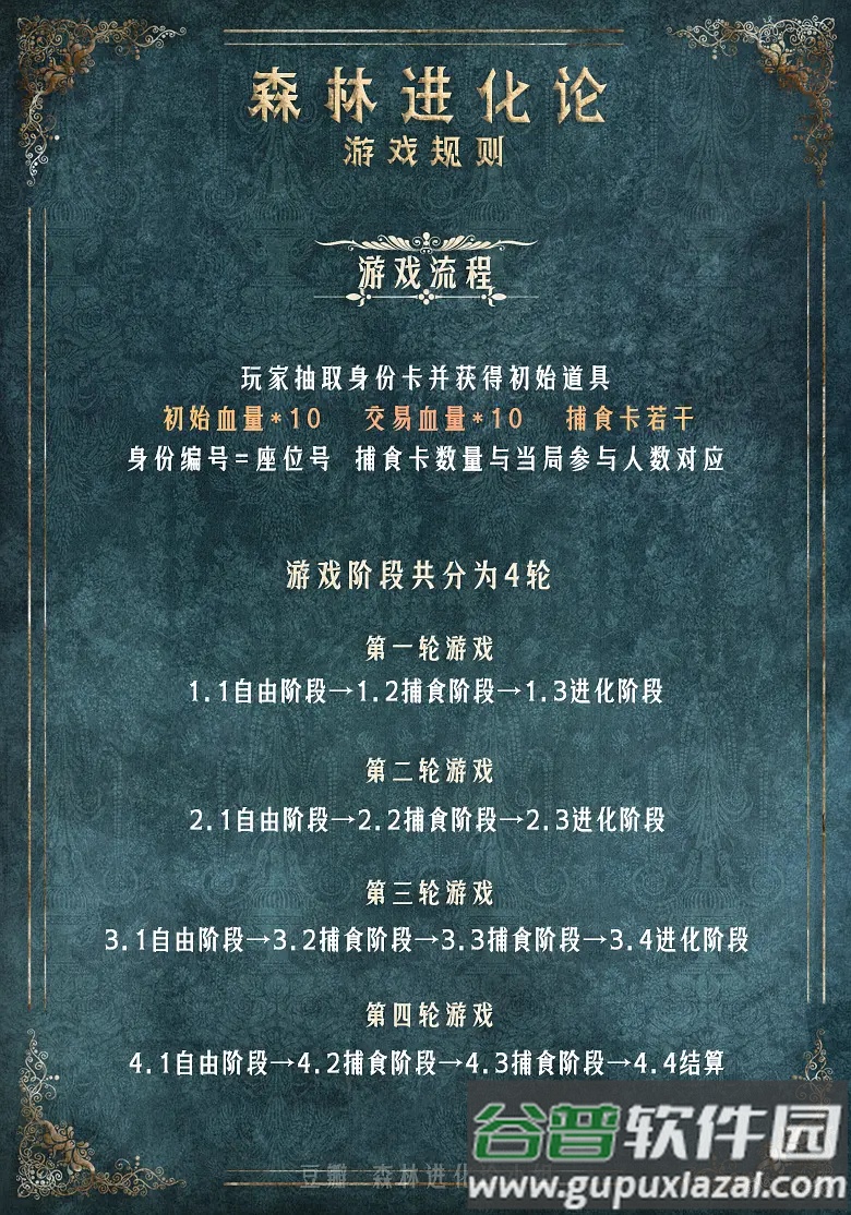 整局游戏共进行四个回合,每个回合包含三个环节:自由讨论、捕食阶段、进化阶段。