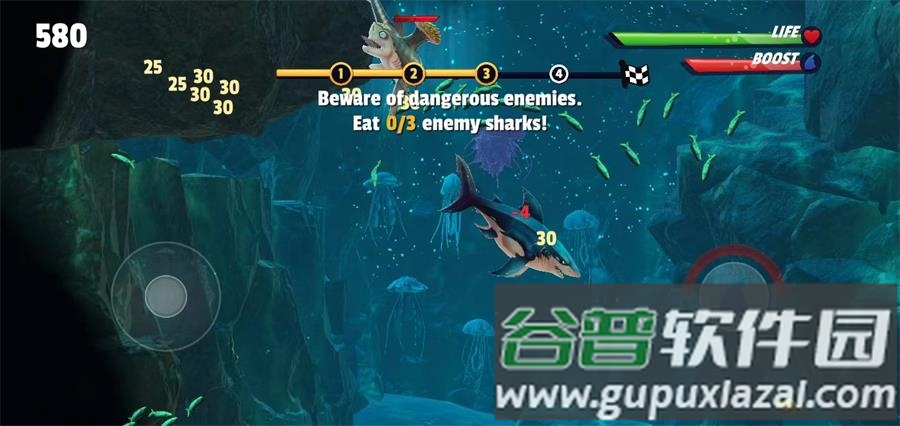 4.游戏中的挑战有多种形式,比如和恐龙或其他鲨鱼进行战斗等,增加游戏的难度和趣味性。