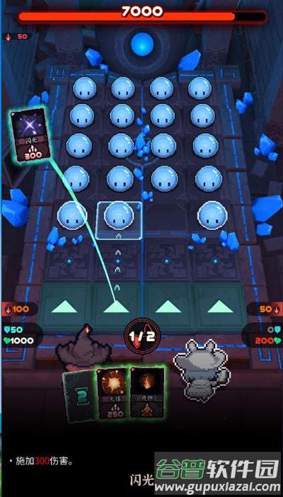 1、游戏使用卡牌与版面敌人战斗,任意拖动卡牌至版面即可使用;