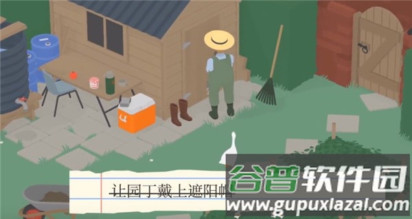 4、等园丁找不到帽子返回时,悄悄跟在他后面;跟随园丁到他房子的后门,他会拿出一顶遮阳帽戴上,这样“让园丁带上遮阳帽”任务就完成了。