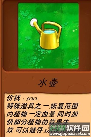 5、水壶:恢复选定范围内所有植物的血量,并加快部分植物的效果;该道具可以存储三次使用次数。