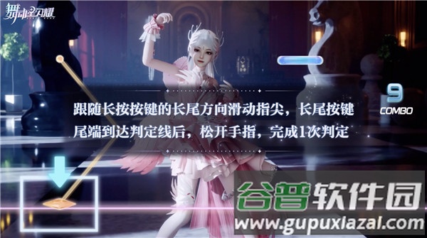 2、长按:黄色按键并带有长尾。音符到达判定线后,按住不松手;同时指尖跟随长尾方向滑动,待长尾末端到达判定线时松开手指,完成一次判定。中途松开或滑动轨迹与长尾不符均算操作失败,记为Miss。