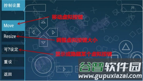 13、选择“自定义布局”可调整虚拟按键位置,默认在move项下可移动按键,点resize后可通过滑动调整按键大小与间距;