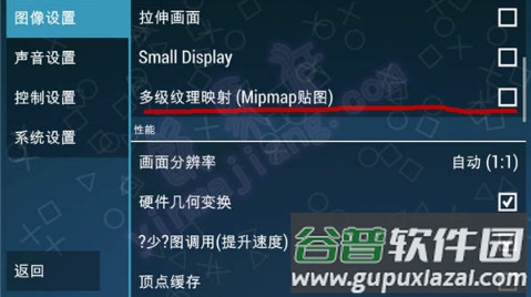 6、将多级纹理有时后面的勾选去掉,画面分辨率、硬件几何变换等选项影响相对较小,可按图设置;