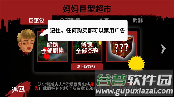 2、点击左上角“禁用广告”或“妈妈巨型超市”,进入购买页面;此处可免费领取各类礼包,包含剧集、角色与武器等;购买任意礼包均可解锁免广告特权。