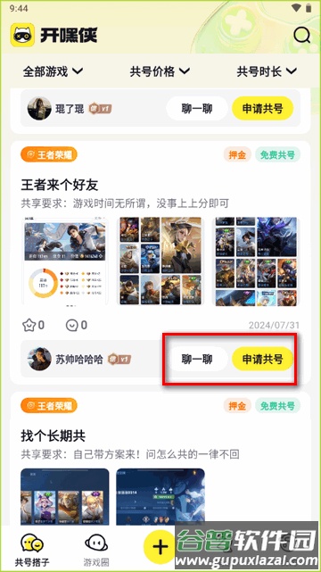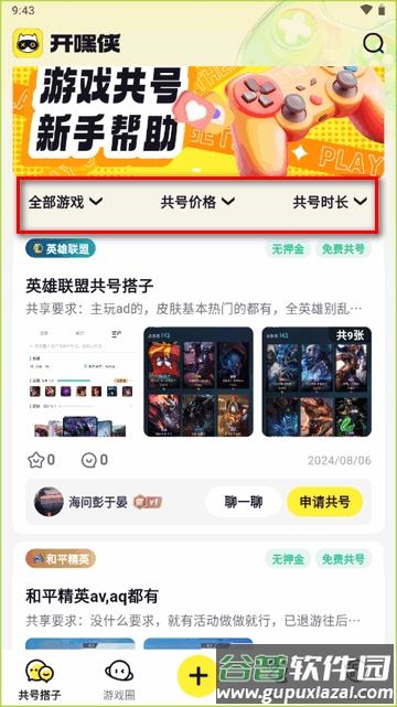 2、在共号搭子页面,根据需求选择游戏类型、时长以及价格范围。