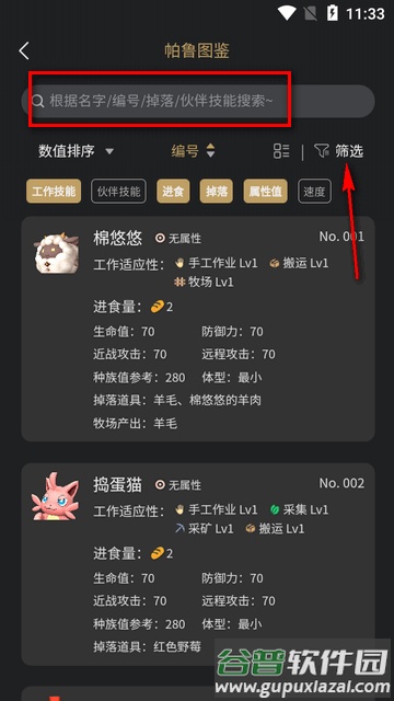 3、例如查询帕鲁图鉴,可按名称、编号、掉落物或伙伴技能进行搜索。