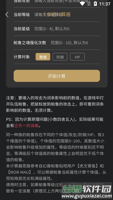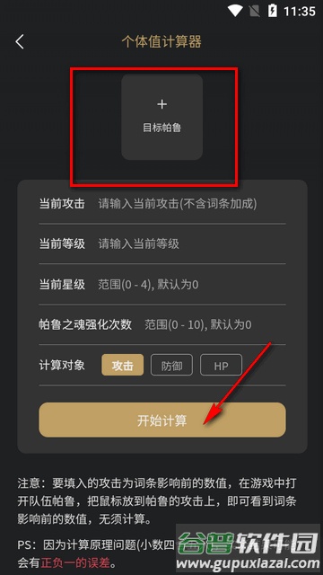 2、输入目标帕鲁及其攻击、防御与生命值等数据,点击开始计算。