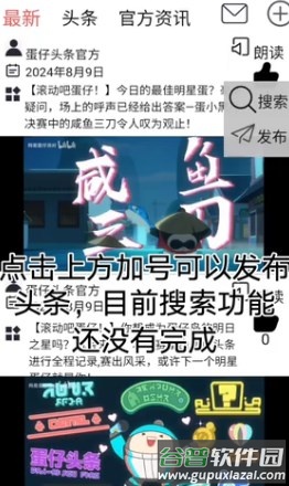 1、点击页面上方的加号可以搜索头条,该搜索功能尚在完善中,下方的纸飞机图标则是发布入口;