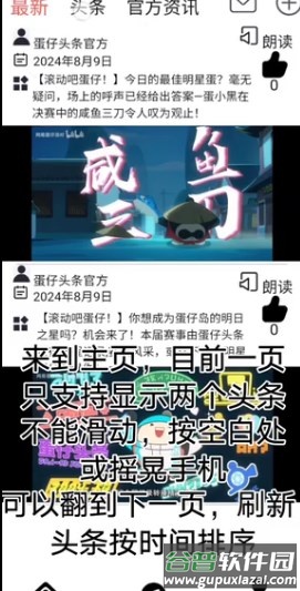 2、页面不支持滑动翻页,需要点击空白区域或摇晃手机才能切换到下一页,头条内容按发布时间顺序排列;