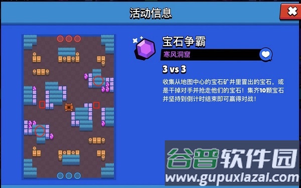 1、宝石大赛(3v3):团队协作,智取对手。收集并持有十颗宝石即可胜利;被击败则会掉落全部已持有的宝石。