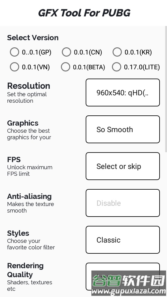1、选择游戏版本;启动工具后,首先在主界面选择与你手机中所安装的PUBG相匹配的游戏版本。