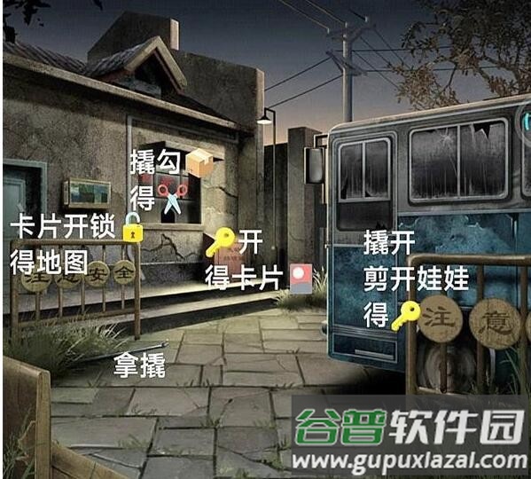 3、利用撬棍将售票处的盒子拖出,获得剪刀;用剪刀剪开娃娃得到钥匙,再用钥匙打开失物招领处,取得卡片。