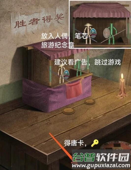 8、放入人偶、笔芯与旅游纪念章,得到唐卡和一把钥匙。