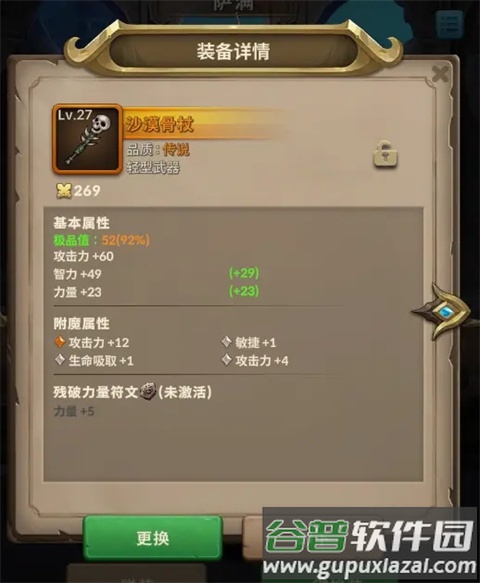 最后是符文属性;地图掉落的装备均自带一个符文,未激活的符文需在锻造台激活后生效;也可将获得的优质符文镶嵌至装备上以增加属性,但前期不建议这样做。