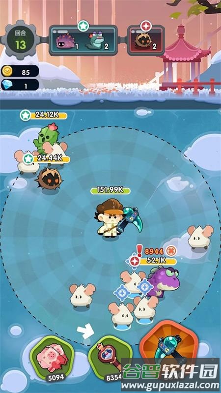 核心玩法曾在早期单机休闲游戏中出现,属于兼具技巧的休闲类型。主角攻击区域顺时针旋转,触碰到怪物时攻击可造成伤害;但由于转速较快、怪物站位分散,加上武器攻击范围各异,手动操作难以实现最优覆盖。