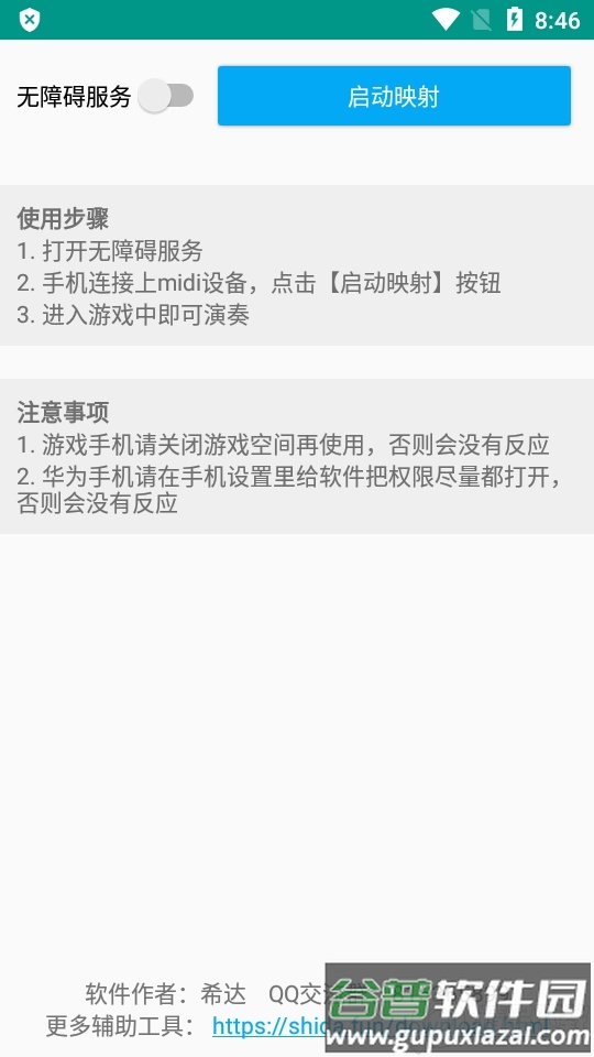 这是一款运行于安卓平台的映射软件,能将真实midi键盘的弹奏信号同步转化为游戏内的钢琴按键动作。