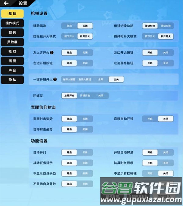 包括枪械操作习惯设定、陀螺仪开启关闭、弯腰射击细节调整以及各类功能开关选项。