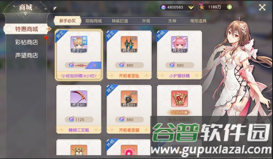 商城系统包含三个板块:特惠商城、彩钻商店与声望商店。